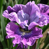 ТЕТРАПЛОИД. Клубнично-сиреневые стандарты, стайлы сиреневые с голубым центром. Фолы парящие, хорошо гофрированные, клубнично- пурпурные с синим хало вокруг белого сигнала. |