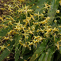 Мелкие, очень темно-зеленые листья. Высокое, более 50 см высотой, соцветие несет 50+ мелких колокольчатой формы цветов светло-желтого цвета с легким красным налетом снаружи.