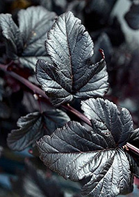Physocarpus opulifolius Black NightCорт с очень темными, пурпурно-черными (почти черными) листьями. Высота в 10 лет около 1,5м. Крона узкая, стремится к колоновидной.