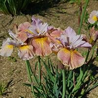 Стандарты очень светло-сиренево-розовые. Фолы светло-желтые с густым красно-фиолетовым напылением, визуально выглядят как бежево-розовые, интересный оттенок. Большой желтый сигнал. Красивый сорт |