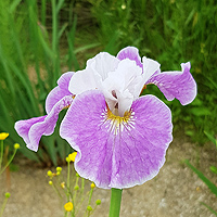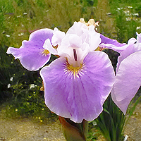 Гибрид ириса сибирского с ирисом щетинистым (sibirica x setosa). Мощный сорт. Цветы довольно крупные на высоких цветоносах. Стандраты небольшие, почти белые. Фолы широкие, волнистые, сочного сиренево-розового цвета. |