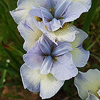 Стандарты очень бледно-голубые. Фолы молочно-белые с неясным желтым сигналом и очень светлым голубым жилкованием, более ярким по краям. Очаровательный бело-голубой сорт, единственный в своем роде. |