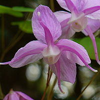 Листья удлиненнеы, блестящие, весной с пурпурно-розовыми пятнами. Цветы крупные, винно-розовые с длинными шпорцами, кремовыми на концах. Высота около 30 см.