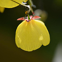 Сердцевидные зазубренные листья, пурпурные черные цветоносы и многочисленные ярко-желтые цветы с красными чашелистиками. Высота около 30 см.