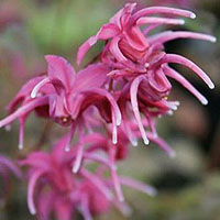 Молодые крупные колоритные темно-зеленые, весной красные. Цветет обильно ярко-розовыми цветами с красными чашелистиками. Высота до 40 см.