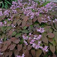 Весенние листья блестящие, шоколадно-красные. Цветы лавандовые красиво контрастируют с листьями. Высота около 30 см.