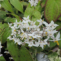 Молодые листья насыщенного бронзового цвета. Цветет обильно. Некрупные белые цветы красиво контрастируют с бронзовыми листьями. Высота около 20 см.