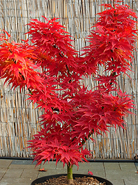 Карликовый японский клен. В 10 лет высота около 100 см. Крона густая, ярусная. Листья пяти-семи лопастные, с длиннными тонкими долями. Весной листья кирпично-красные; летом темно-красные; осенью - ярко-красные