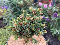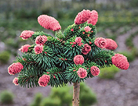 Поникающая компактная форма с желтой хвоей и яркими малиновыми шишками, которая долго сохраняет желтый цвет. В 10 лет высота около 100 см, ширина 120-130 см.