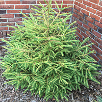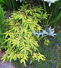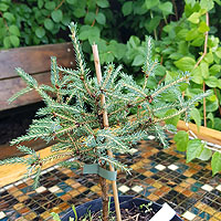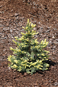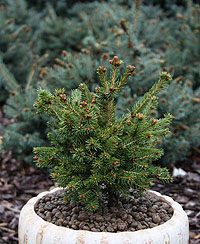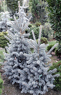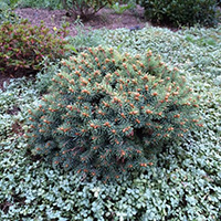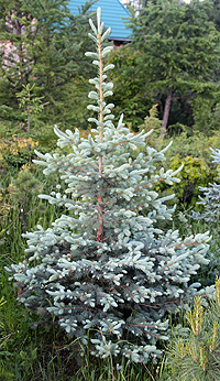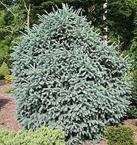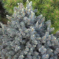 Плотная и компактная ель в форме широкой пирамиды. В 10 лет высота и ширина около 100 см. Хвоя сине-зеленая.