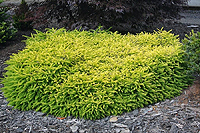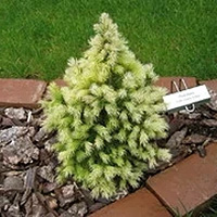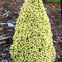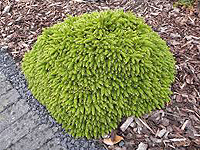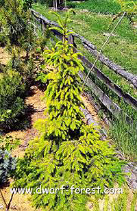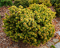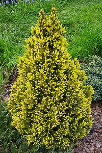 Карлик с ярко-желтой молодой хвоей. Выглядит желтым весь летний сезон. Не горит. Рост сначала шаровидный, с возрастом в естественной форме может приоретать конусовидную форму. Годовой прирост 3-4 см. В 10 лет размер около 40 см.