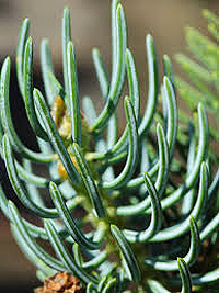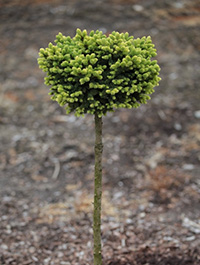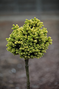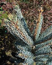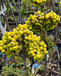 Компактная форма. Хвоя темно-зеленая с золотистым налетом, необычного строения.