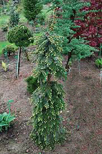 Известный плакучий узколоновидный сорт. Ветви сильно плакучие, растут вертикально вниз. Может расти причудливо изгабаясь. В 10 лет высота 15-=180 см при ширине 40-50 см.