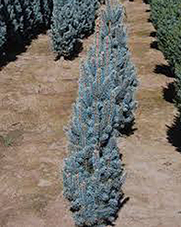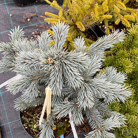 В 10 лет высота около 180 см, ширина около 120 см. Хвоя яркого синего цвета (самый синий из сортов), пушистая. Пожалуй, самый темный (синий) сорт на сегодня.