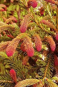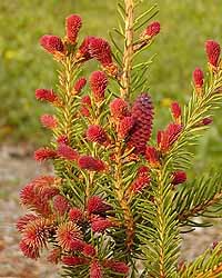 Picea abies CruentaМолодые приросты насыщенно- красные, хорошо выглдяит в стрижке.. В 10 лет высота 2-2.5 м.