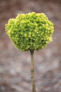 Суперкарлик шаровидной формы.Годовой прирост 1-2 см. Молодая хвоя ярко-желтая.