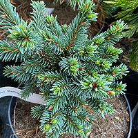 Очаровательный карлик с голубой хвоей. Годовой прирост 2-3 см, 10 лет диаметр 25-30 см.