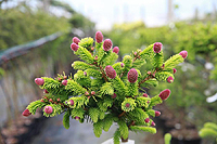 Picea abies Wild StrawberryПодушковидный карлик с ярко-малиновыми шишками весной. Красивая короткая сизо-синяя хвоя. В 10 лет размер 30 - 40 см.