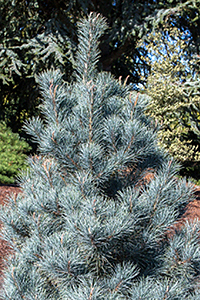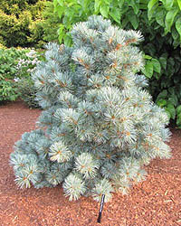 Компактный сорт, многоствольный, с округлой кроной. В 10 лет примерный размер 150 х 150 см. Хвоя крупная, длинная, ярко-синяя.
