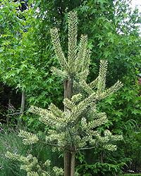 Крупная форма с кремово-белыми приростами и зеленой хвоей. Кончики хвой остаются кремовыми до следующего сезона.