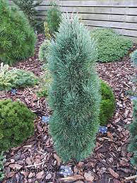 Компактная мутация от сорта Вандервольф Пирамид. Такая же длинная темно-голубая хвоя. Размер - в 10 лет высота около 100 см, ширина 60-70 см.